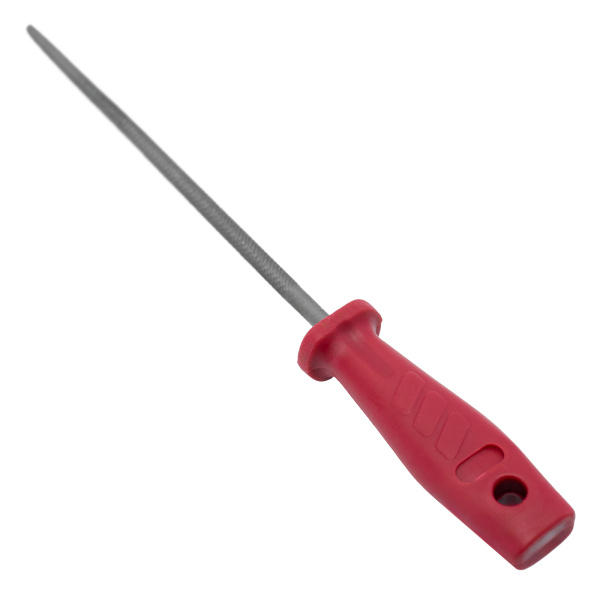 Изготовлен из инструментальной стали твёрдостью 60 HRc. Применяется для чистки контактов, снятия заусенцев, обработки различных поверхностей. Эргономичная пластиковая рукоятка.