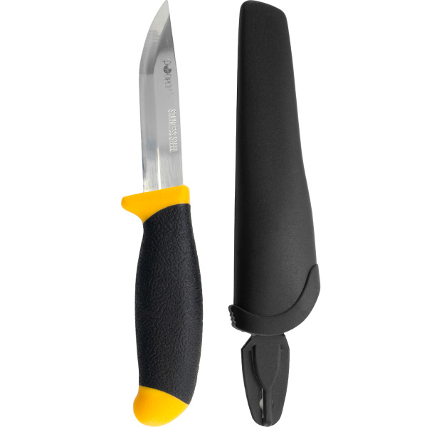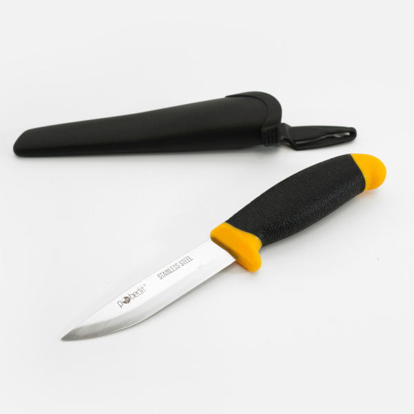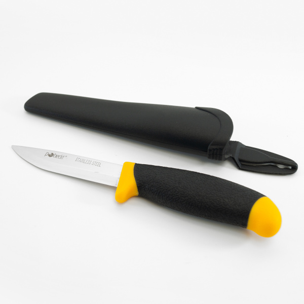 Нержавеющая сталь, прорезиненная ручка, пластиковые ножны.