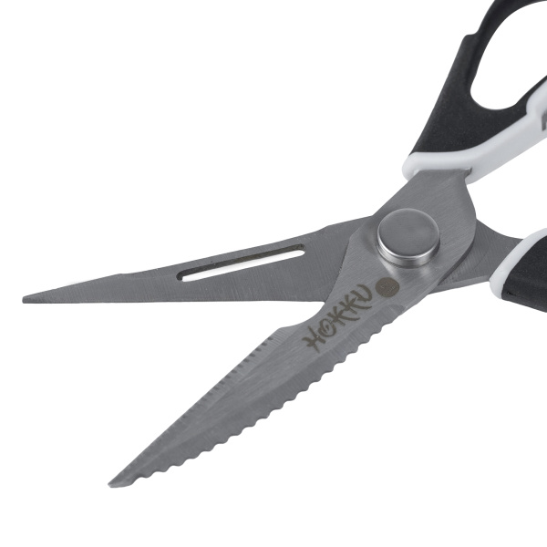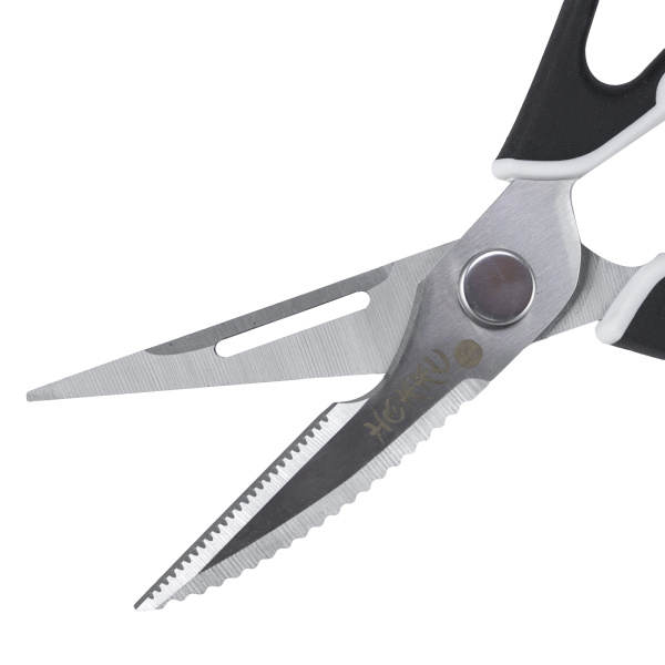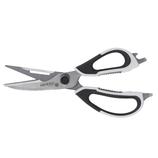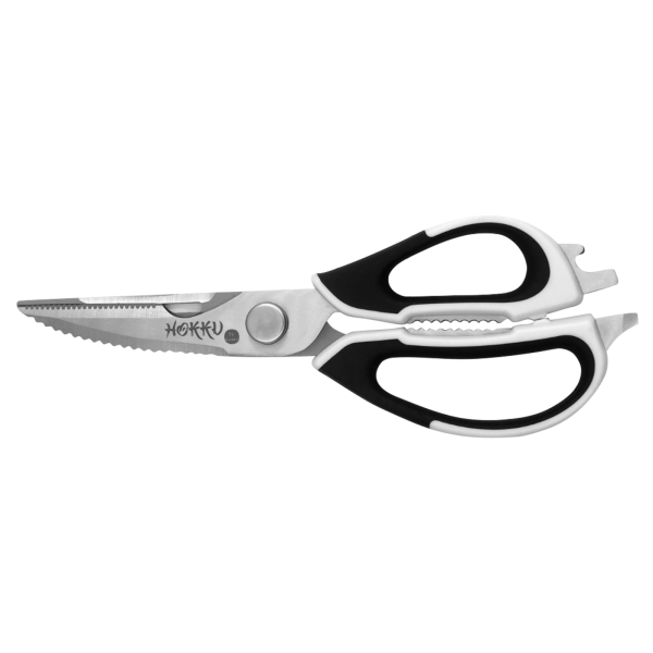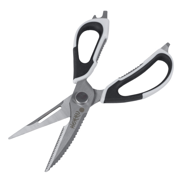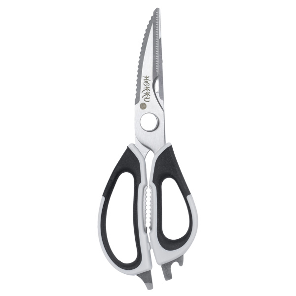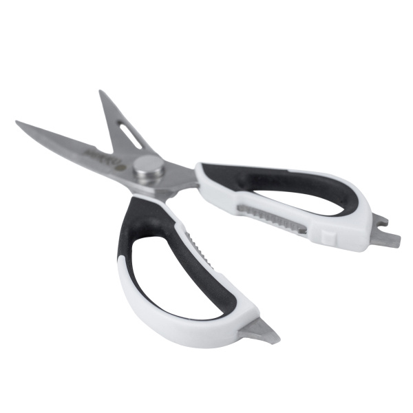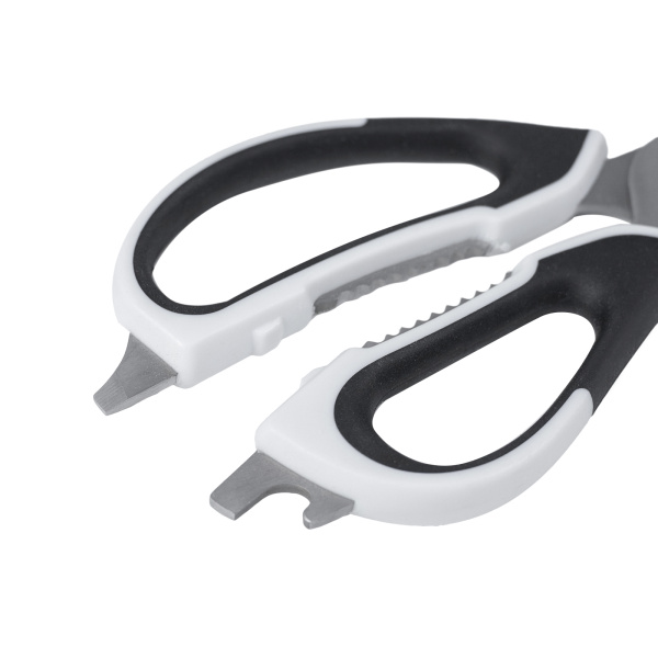 Многофункциональные разборные ножницы для кухни из нержавеющей стали. Режут бумагу, фольгу. Предназначены для вскрытия различных упаковок и нарезки зелени для салатов. Для очистки овощей, разделывания птицы и рыбы. На лезвии открывашка для бутылок. Эргономичные ручки из двухкомпонентного пластика с орехоколом.