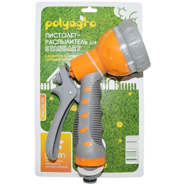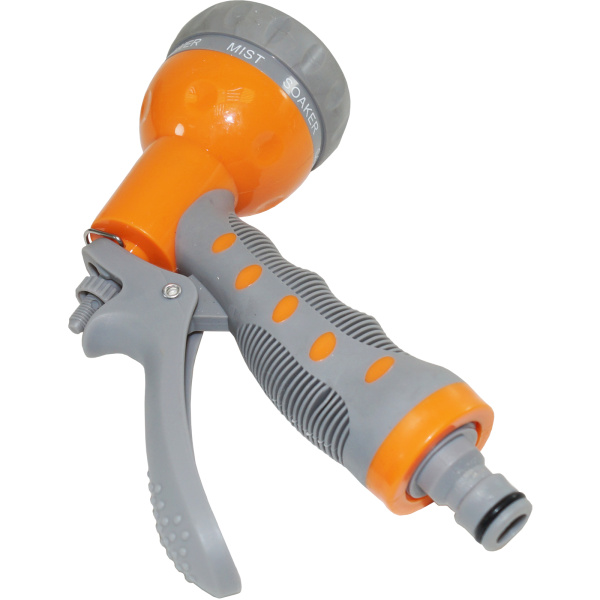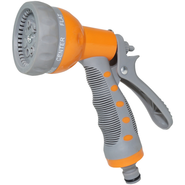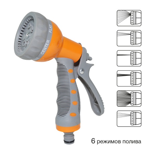 Имеет 6 режимов полива, со штуцерной посадкой и фиксируемым курком. Материал АБС-пластик, обрезиненная рукоятка.