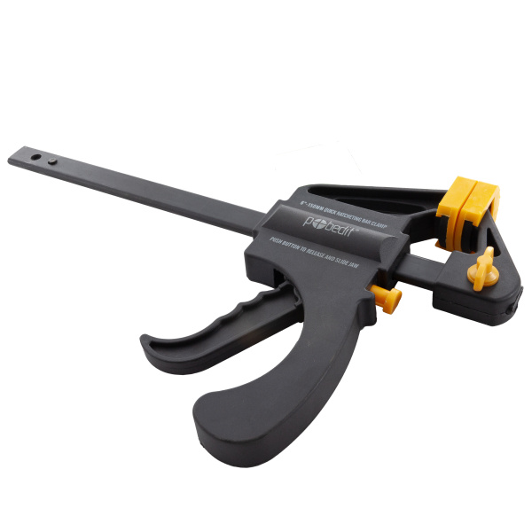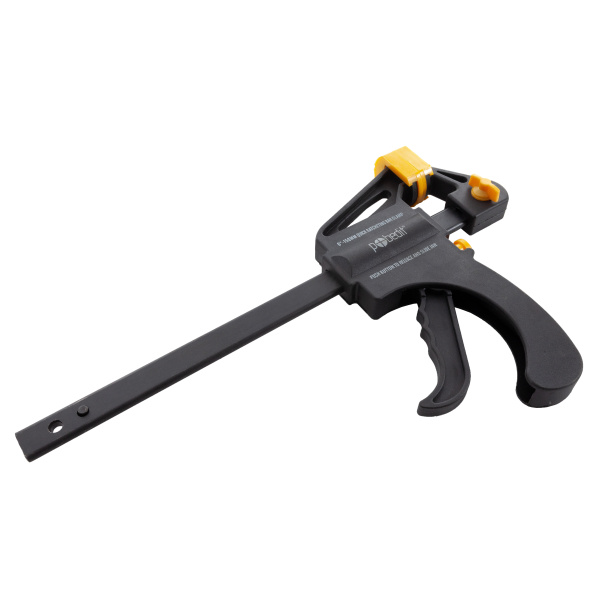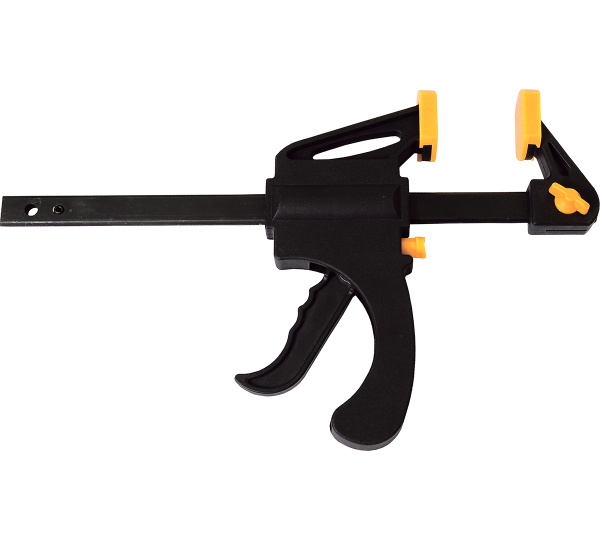 Изготовлена из прочного пластика, инструментальной стали. Снабжена быстрозажимным ручным курковым механизмом. Применяется для фиксации и удержания заготовок при выполнении столярных и слесарных работ.