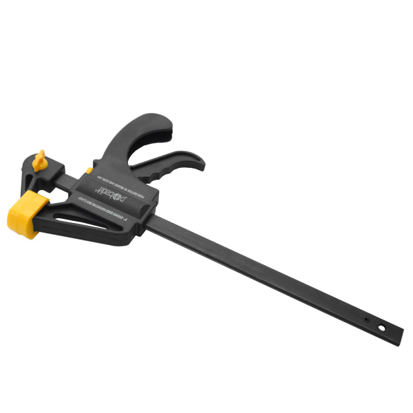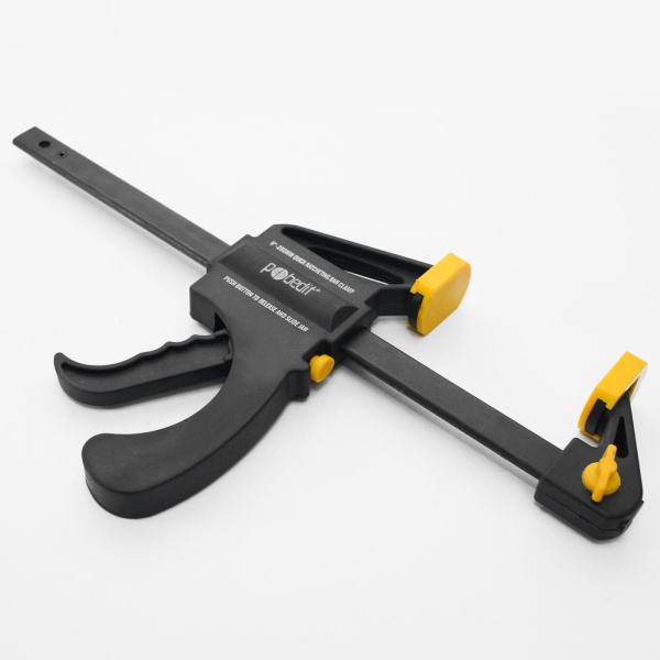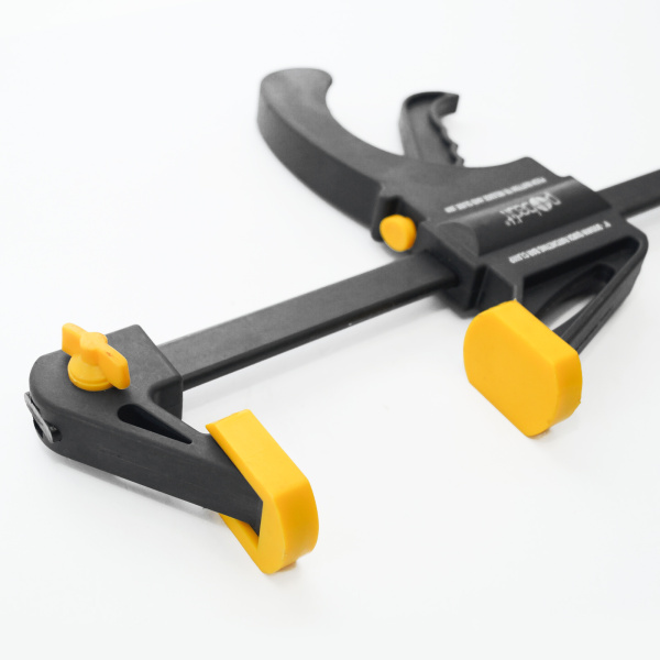 Изготовлена из прочного пластика, инструментальной стали. Снабжена быстрозажимным ручным курковым механизмом. Применяется для фиксации и удержания заготовок при выполнении столярных и слесарных работ.