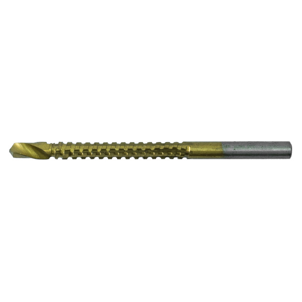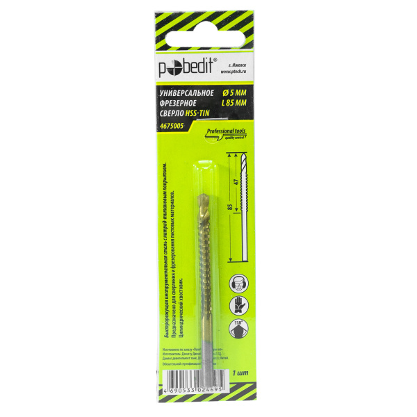 Инструментальная легированная сталь, нитрид-титановое покрытие. Для сверления с последующим фрезерованием листовых материалов