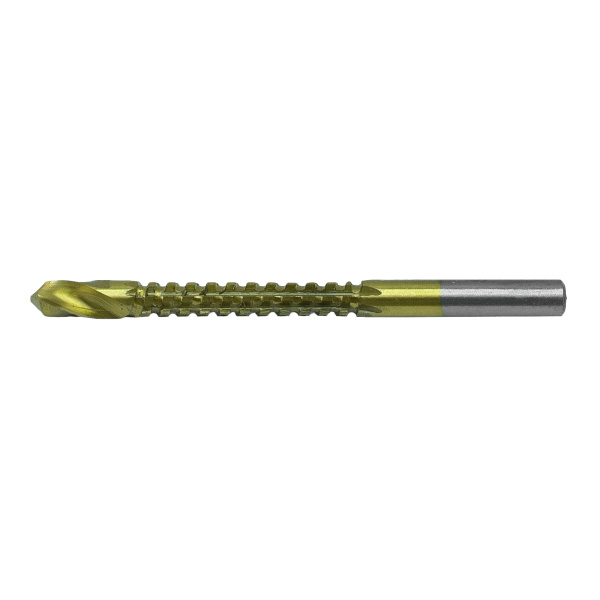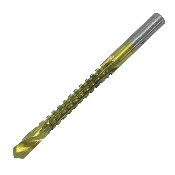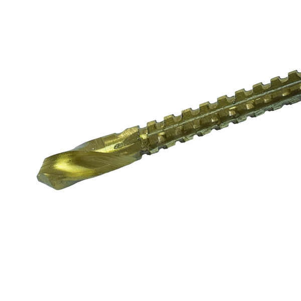 Инструментальная легированная сталь, нитрид-титановое покрытие. Для сверления с последующим фрезерованием листовых материалов