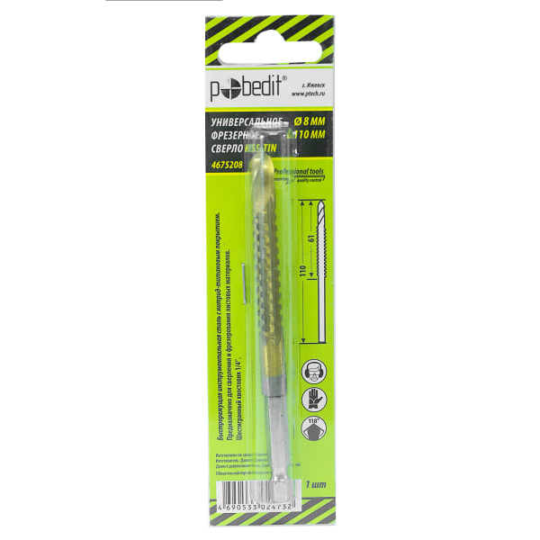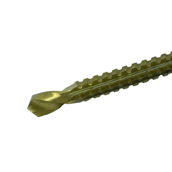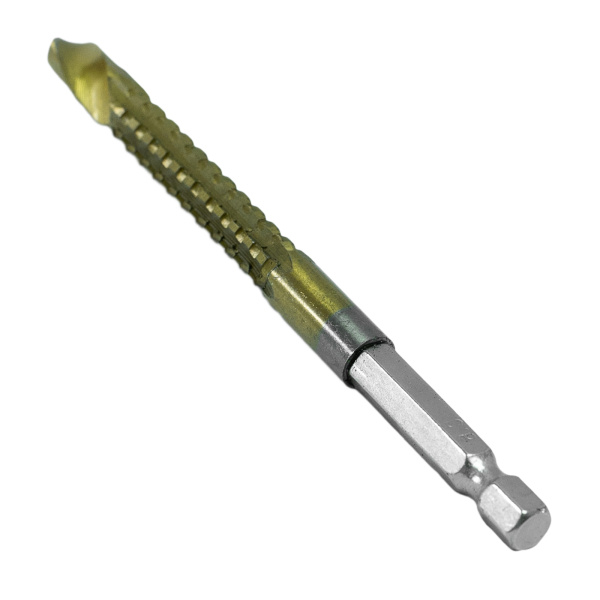 Инструментальная легированная сталь, нитрид-титановое покрытие. Для сверления с последующим фрезерованием листовых материалов