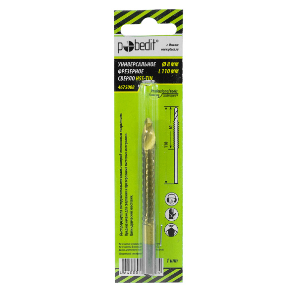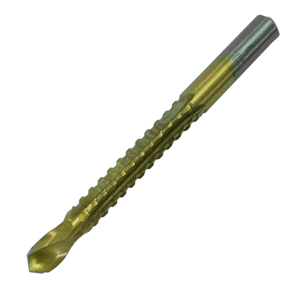 Инструментальная легированная сталь, нитрид-титановое покрытие. Для сверления с последующим фрезерованием листовых материалов