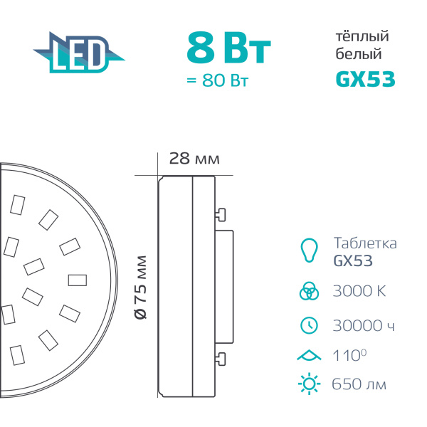 Цоколь GX53. Напряжение 230В. Размер лампы 75х22 (мм).