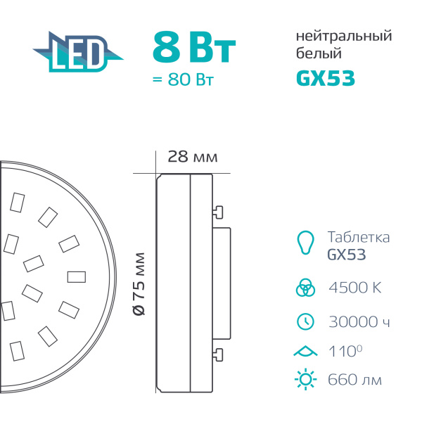 Цоколь GX53. Напряжение 230В. Размер лампы 75х22 (мм).