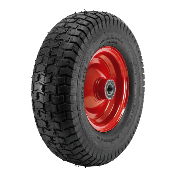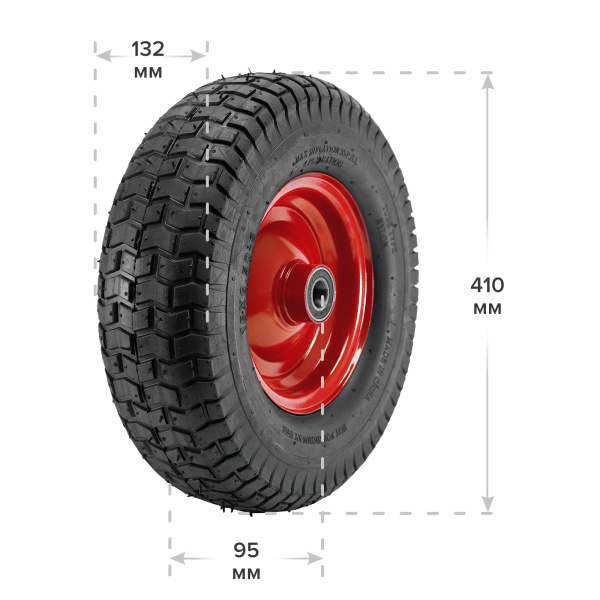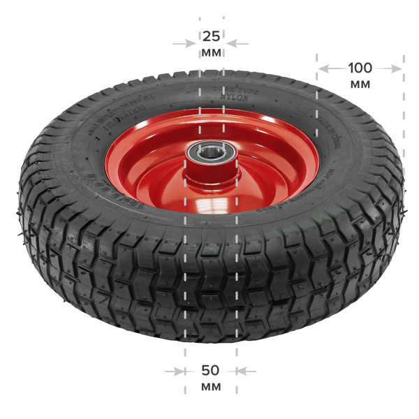 Широкое пневматическое колесо на подшипниках со стальным диском. Диаметр посадочного отверстия 26 мм.