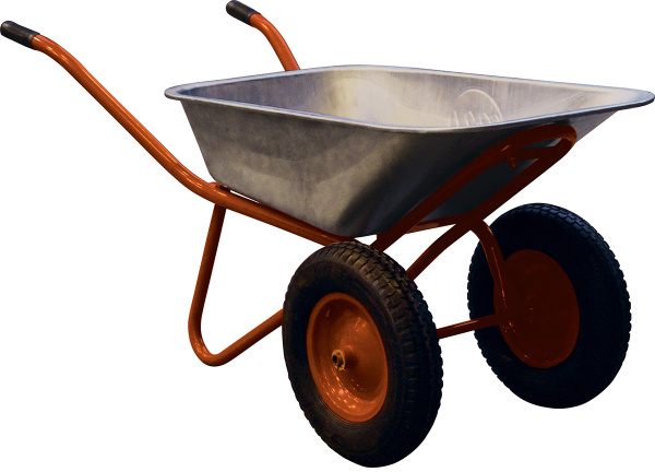 Рама стальная крашеная, обрезиненные ручки, корыто оцинкованное, камерные колеса с подшипниками. Максимальная нагрузка 200 кг. Колесо 3.25/3.00-8, диаметр втулки 20 мм.