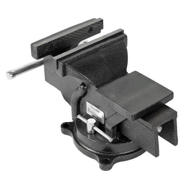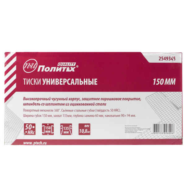 Имеют высокопрочный чугунный корпус, защитное порошковое покрытие, шпиндель со шплинтом из оцинкованной стали. Поворотный механизм 360°. Съемные стальные губки (твердость 50-58 HRC). Ширина губок: 150 мм, захват: 135 мм. Глубина зажима: 60 мм. Наковальня 90х94 мм