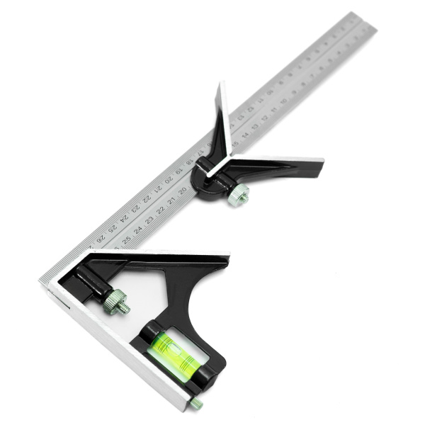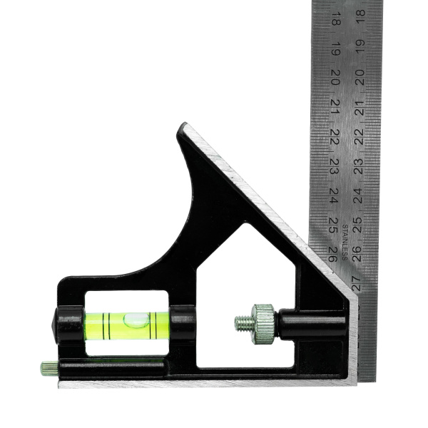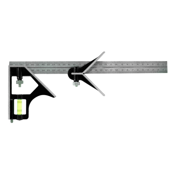 Имеет 2-стороннюю разметку. Комбинированная конструкция позволяет проводить измерение различных углов. Оснащен пузырьковым уровнем.