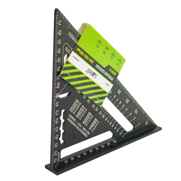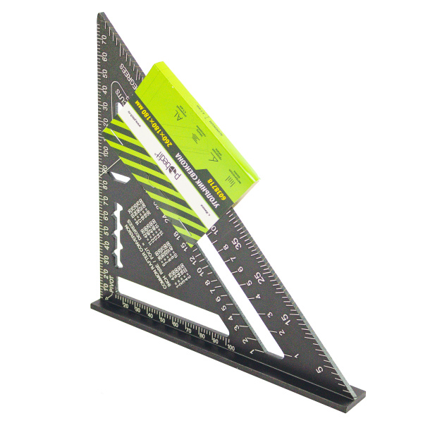 Алюминиевый сплав, 180х260 см, толщина 4,5 мм, метрическая шкала, градусная шкала, шкала смещения, для основных стропил, для угловых стропил и ендов, измерительная губка, шаблон для разметки прогона.