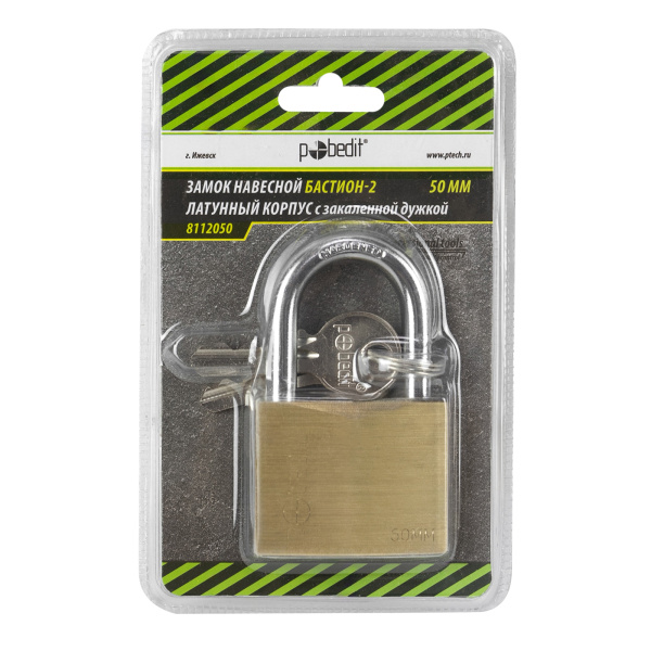 Замок навесной Бастион-2, латунный корпус, с закаленной дужкой, 50мм, Pobedit