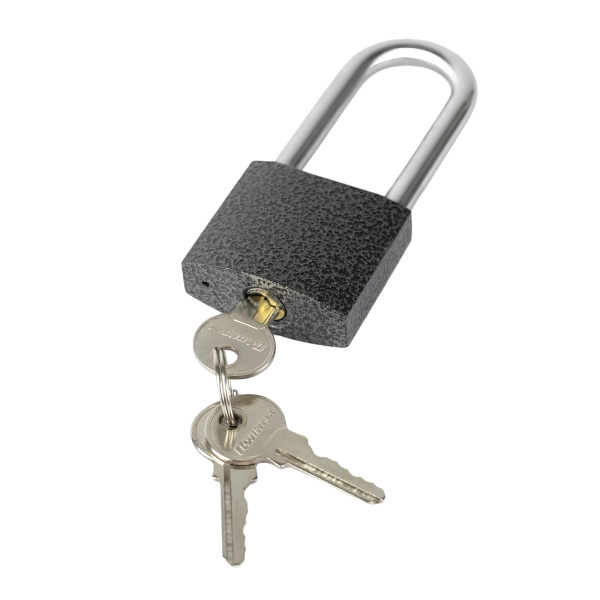 Высокопрочный корпус и стальная закаленная дужка .В комплекте 3 ключа.